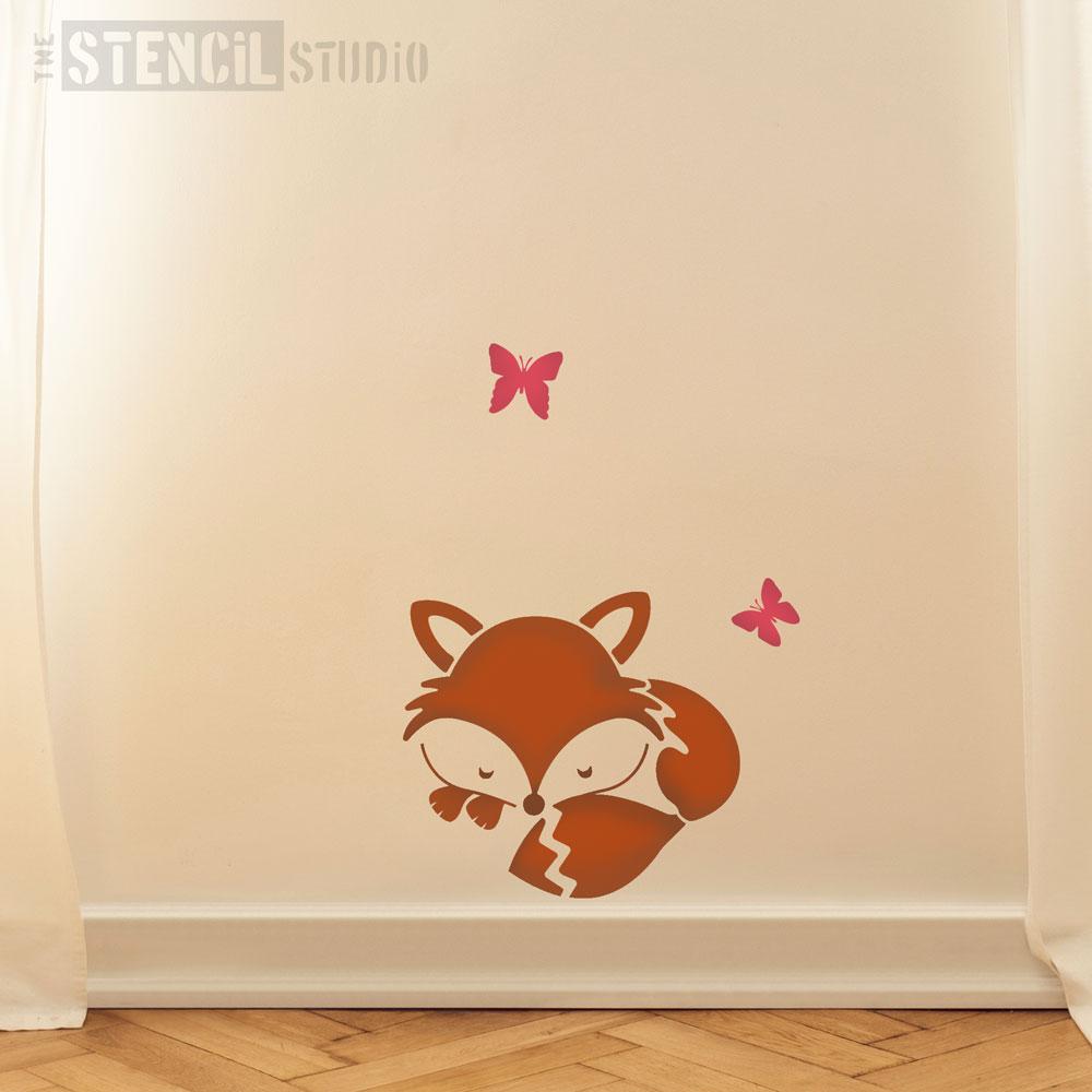Sleeping Fox stencil with fluttering butterfly. Mix and match with our other Woodland Animal stencils including the Sitting Fox or buy both the Sitting and Snoozing Fox Set and save £'s here.