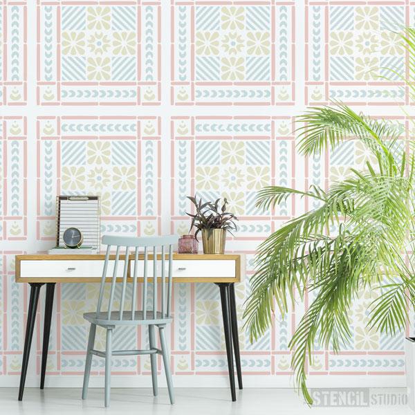 Large panel stencil with folk art borders and flowers. Inspired by the works of Mary Wondrausch, artist, potter, historian and writer. Beautiful folk art patterns, borders and motifs brought together in an easy to use panel and available in several sizes.