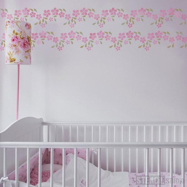 Beautiful garland of little Frangipani flowers and leaves, repeatable stencil for painting a border on walls, great for furniture stenciling too. We've doubled up in the pink nursery picture for a wider border.
